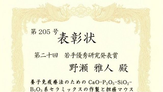 【理工学研究科 応用化学専攻】生体関連材料研究室の野瀬雅人さん(博士前期課程2年)が、第32回無機リン化学討論会において若手優秀研究発表賞を受賞しました