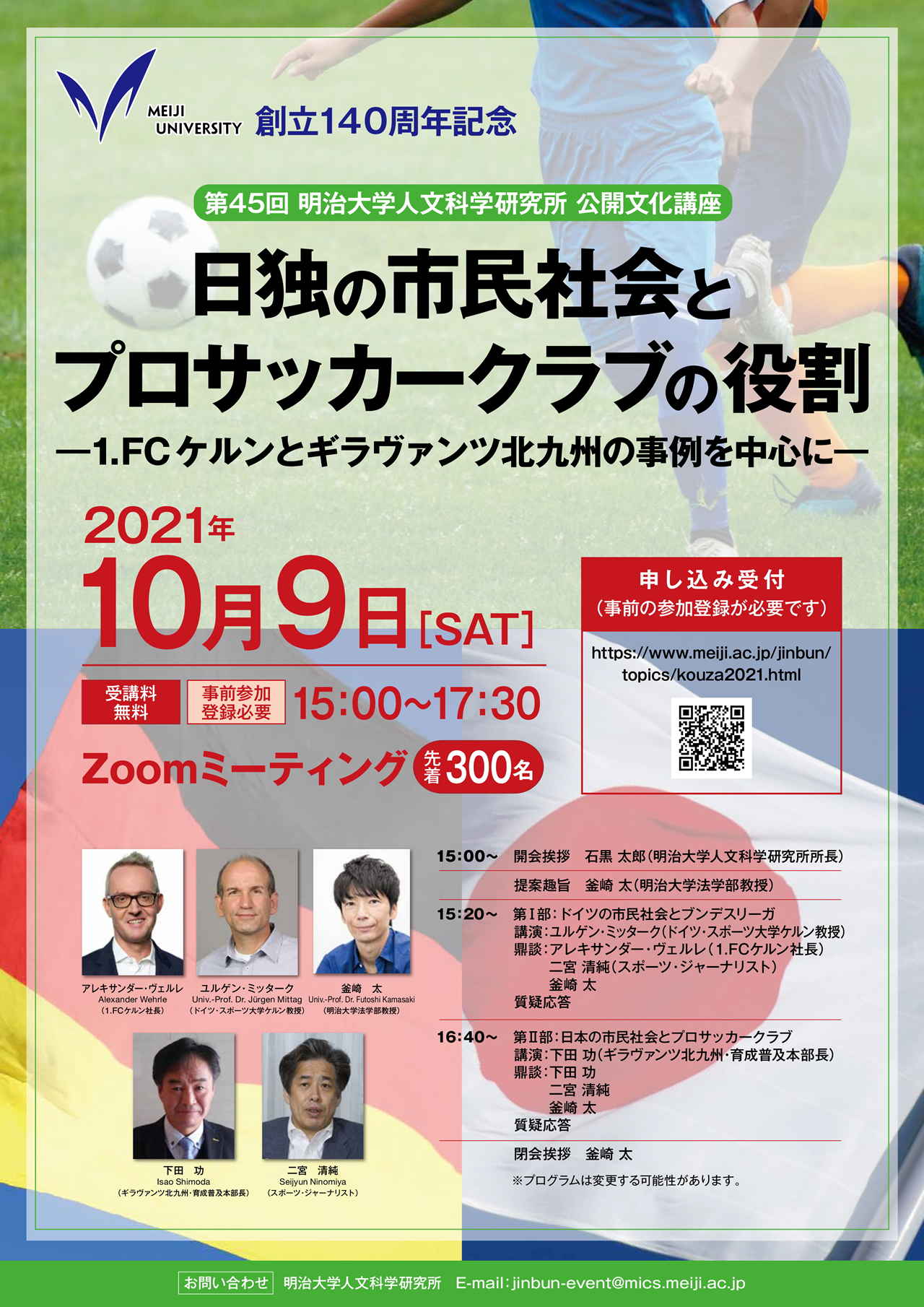 明治大学人文科学研究所(所長=石黒太郎商学部教授)は2021年10月9日に、明治大学創立140周年記念事業の一つとして、第45回公開文化講座「日独の市民社会とプロサッカークラブの役割―1.FCケルンとギラヴァンツ北九州の事例を中心に―」をオンラインで開催しました。