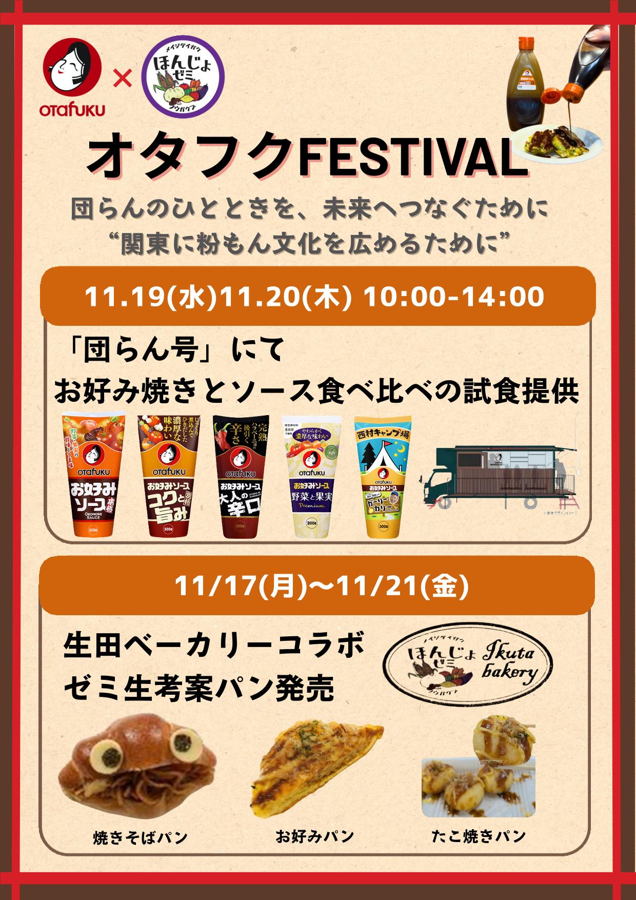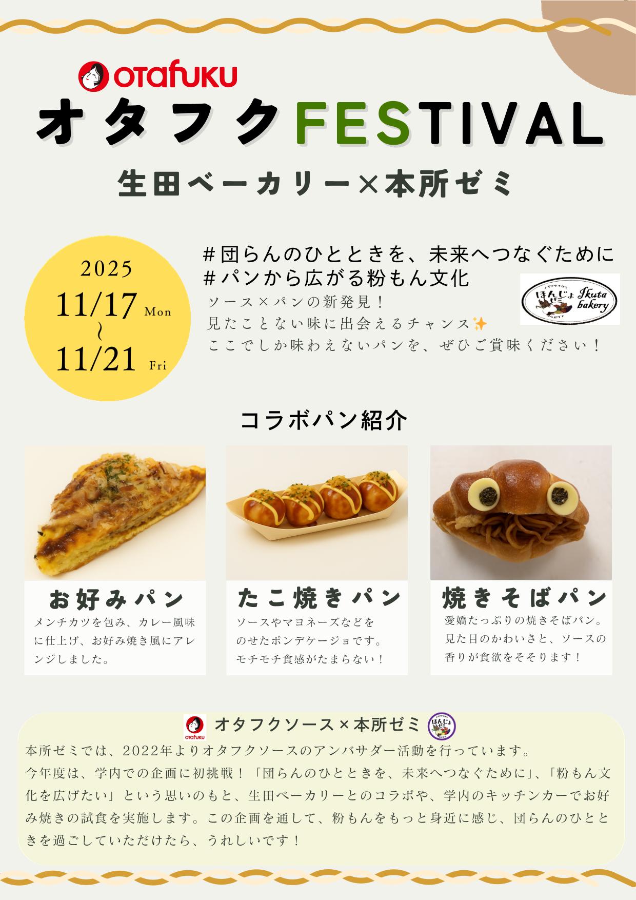 オタフクソース株式会社とは2022年度から同社のアンバサダー活動をしていますが、この度、この一週間に2つの企画を展開します。1つめは生田ベーカリーにて学生考案のコラボパン「お好み焼きパン」「たこ焼きパン」「焼きそばパン」を数量限定で5日間販売します。2つめはオタフクソースのキャラバンカー「団らん号」が生田ベーカリー前に初登場して、豚玉のミニお好み焼きを試食提供します。このお好み焼きはオタフクソースで焼き研修を受けた学生が社員の指導のもと、お好み焼きを焼いて試食提供します。