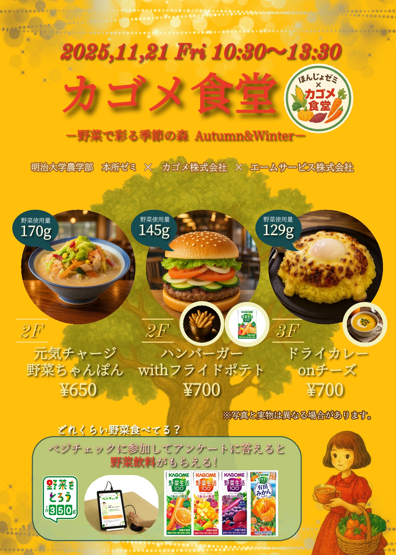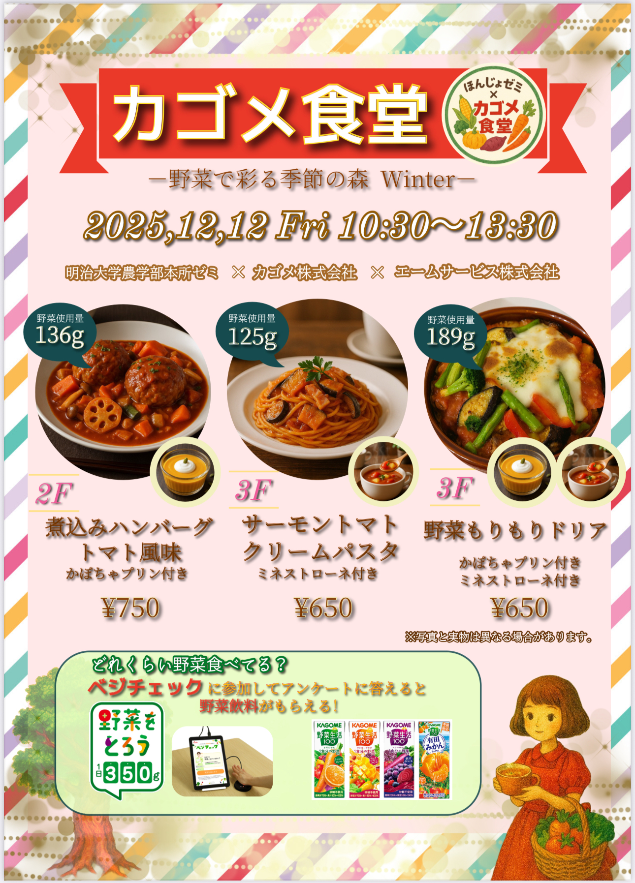 本所靖博准教授)研究室が、【ベジークリスマス!野菜を摂って心も身体もあっためマス!】をテーマに、秋学期もカゴメ食堂2025秋冬を開催します!今回のカゴメ食堂では11月も12月も3メニューを展開、秋冬にぴったりの“あったか野菜メニュー”をご用意しました野菜を美味しく、楽しく、上手に摂取してもらえるようなメニューを用意しました!ぜひ友達と一緒に、野菜や食のことを語りながら味わってみてください。