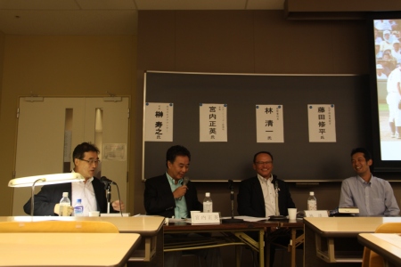 トークイベントは、元NHKアナウンサーの榊寿之氏の司会で、夏の甲子園審判を20年務めた林清一氏、スポーツニッポン記者の宮内正英氏らが、阿久悠の見つめた甲子園について熱く語りあいました。イベント後半では林氏の「忘れられない試合」の当事者である元宇部商投手の藤田修平氏が登場。15年ぶりに再会した二人はがっちりと握手を交わし、当事者ならではのやり取りに会場は大いに盛り上がりました。
