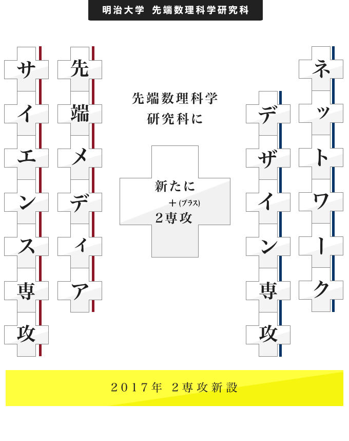 2013年に生まれた総合数理学部 先端メディアサイエンス(FMS)学科は、斬新な教育カリキュラムによる人材育成、イノベイティブな研究成果で世間の注目を集めてきました。2017年度からスタートする先端メディアサイエンス(FMS)専攻は、その学科に接続する大学院です。数理科学に重点を置きながら、「人間系」「コンピュータ系」「インタラクション系」を3つの柱とし、従来の理論分野の枠を超えて、社会と人間、異文化との交流などの広い視野を身に付け、自在に独創的なメディアを設計して実現する実践力を習得していきます。