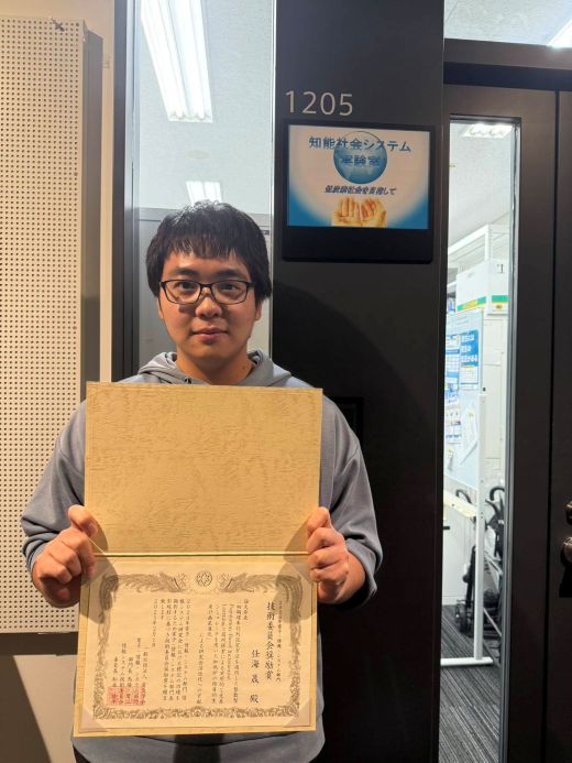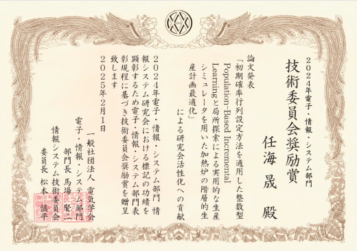 先端数理科学研究科ネットワークデザイン専攻博士前期課程1年任海晟さん(福山良和研究室)が、電気学会情報システム研究会で2024年電気学会電子・情報・システム部門技術委員会奨励賞を受賞しました。この賞は、部門の技術委員会の主催研究会において、35歳以下の若手研究者の中で、若手技術者にふさわしい優秀な論文発表に対し授与されます。