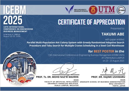 先端数理科学研究科ネットワークデザイン専攻博士前期課程2年阿部拓海さん(福山良和研究室)が13th International Conference on Engineering Business Management (ICEBM 2025)においてBest Poster 賞を受賞しました。