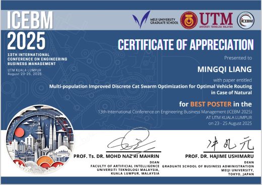 先端数理科学研究科ネットワークデザイン専攻博士前期課程2年のMingqi Liangさん(福山良和研究室)が13th International Conference on Engineering Business Management (ICEBM 2025)においてBest Poster賞を受賞しました。