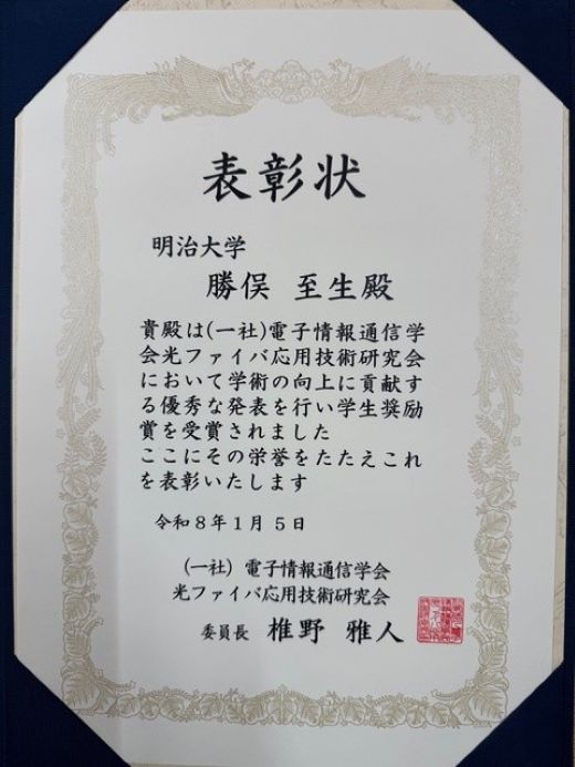 先端数理科学研究科ネットワークデザイン専攻博士前期課程2年(発表時)勝俣至生さんが電子情報通信学会光ファイバ応用技術研究会において学生奨励賞を受賞しました。