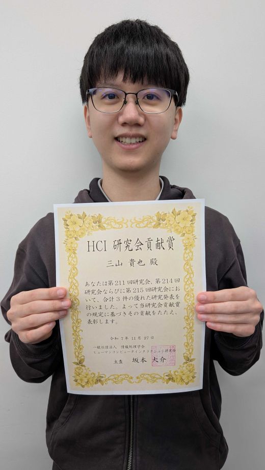 先端数理科学研究科先端メディアサイエンス専攻博士前期課程2年の三山貴也さん(中村聡史研究室)が2025年11月27日に淡路夢舞台国際会議場にて行われた情報処理学会 第215回 ヒューマンコンピュータインタラクション研究会においてHCI研究会貢献賞を受賞しました。