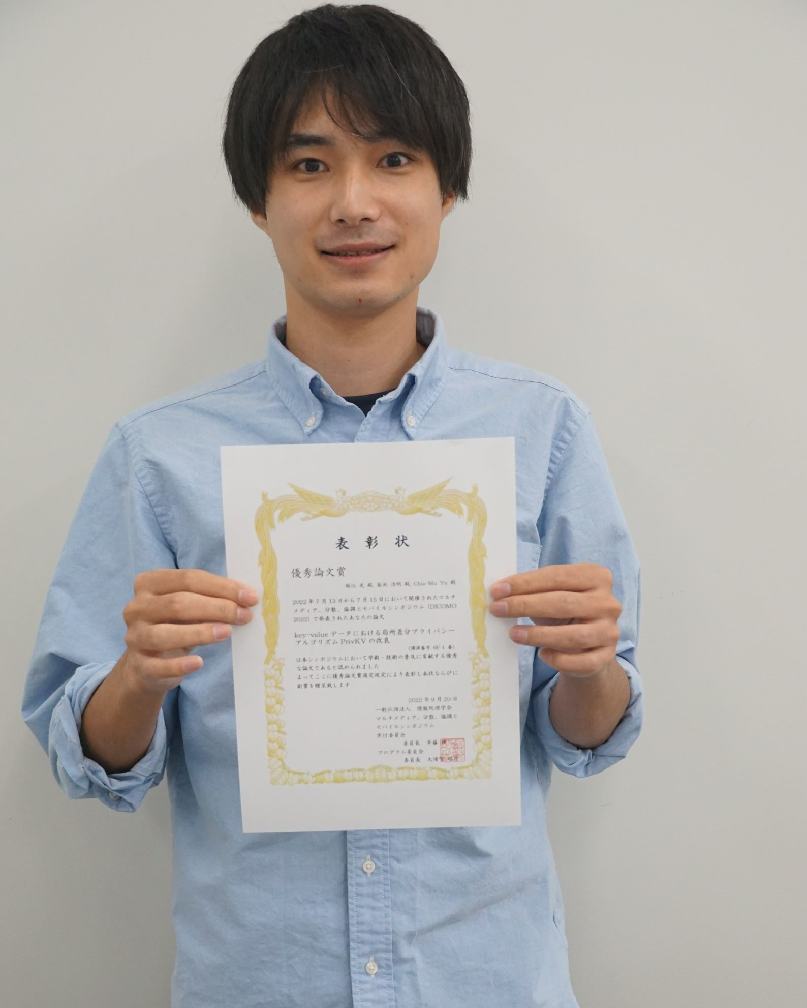 先端数理科学研究科先端メディアサイエンス専攻博士前期課程2年の堀込光さん、菊池浩明教授、Chia-Mu Yu准教授(National Yang Ming Chiao Tung Univ.)が情報処理学会シンポジウム「DICOMO2022」において優秀論文賞を受賞しました。