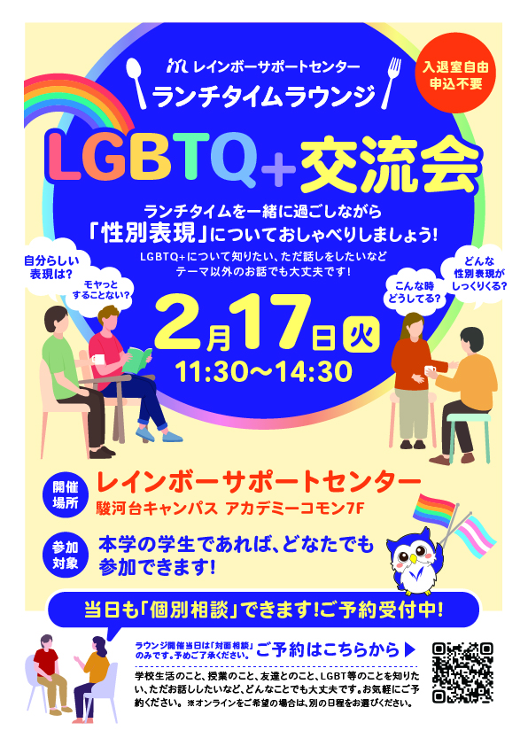 レインボーサポートセンターは、駿河台キャンパスにて「ランチタイム対面ラウンジ< LGBTQ+交流会 〜性別表現についておしゃべりしましょう!〜>」を開室します。