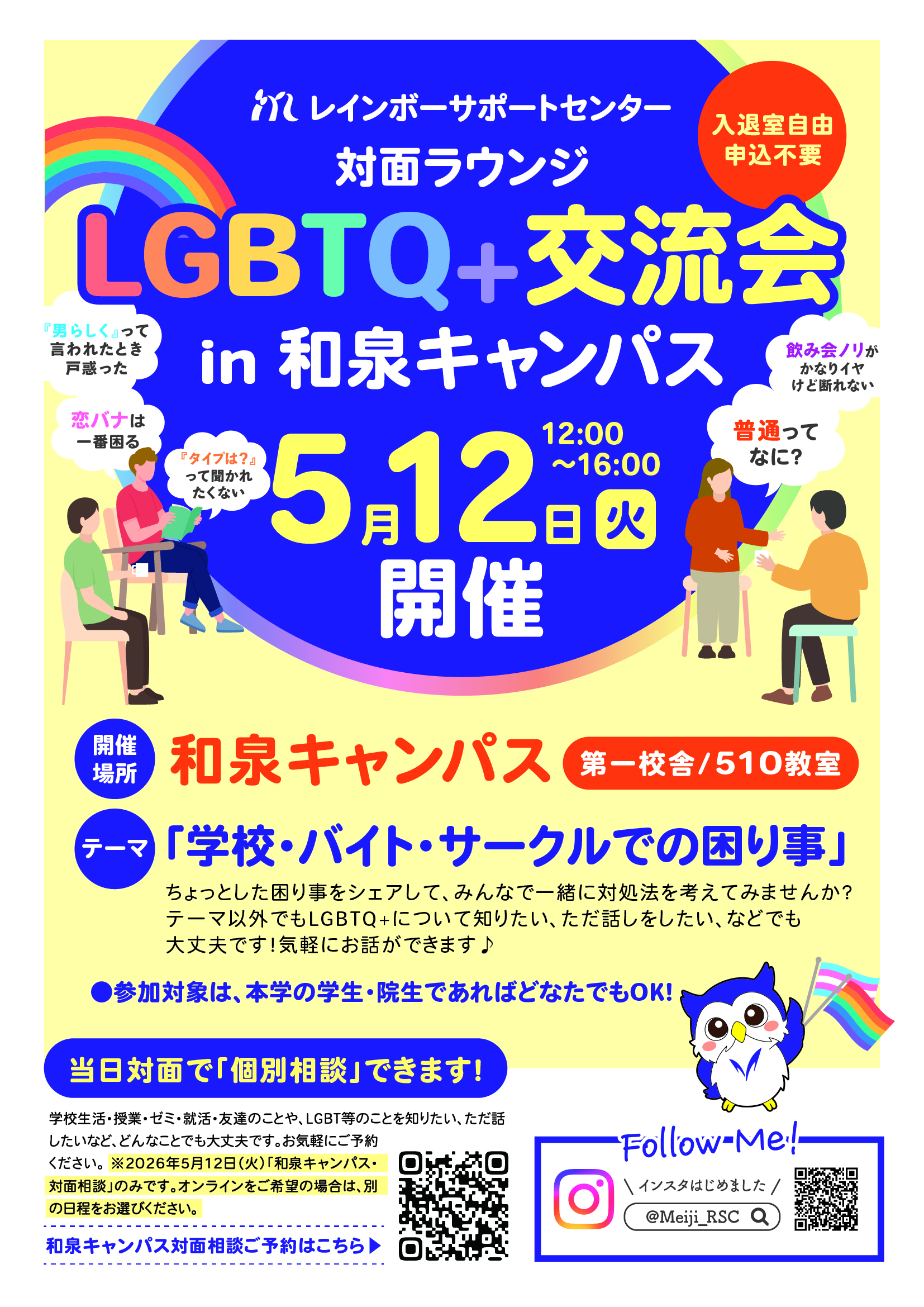【和泉キャンパス<LGBTQ+交流会>(対面ラウンジ)・個別相談】