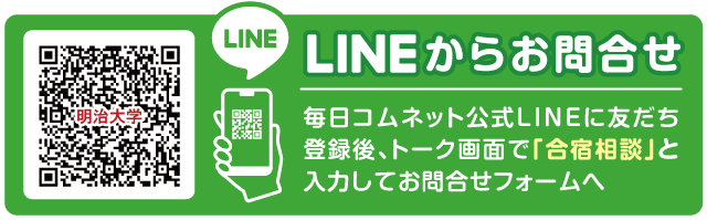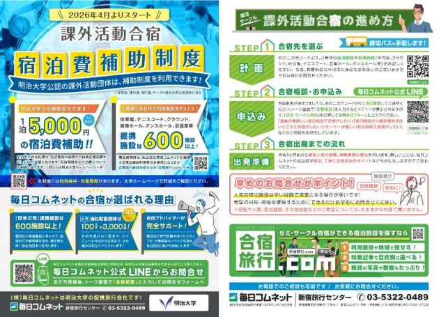 補助受給確定後、株式会社毎日コムネット(明治大学提携旅行会社)を通じて合宿を手配してください。