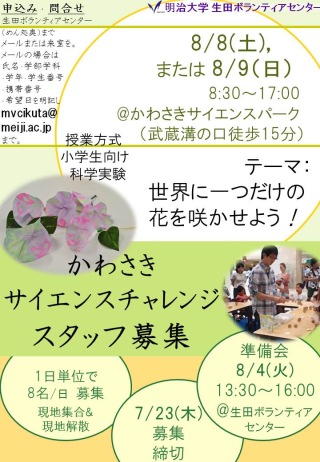 生田ボランティアセンターは、夏休み、「子ども向け科学教室ボランティア」を、下記の通り募集します。