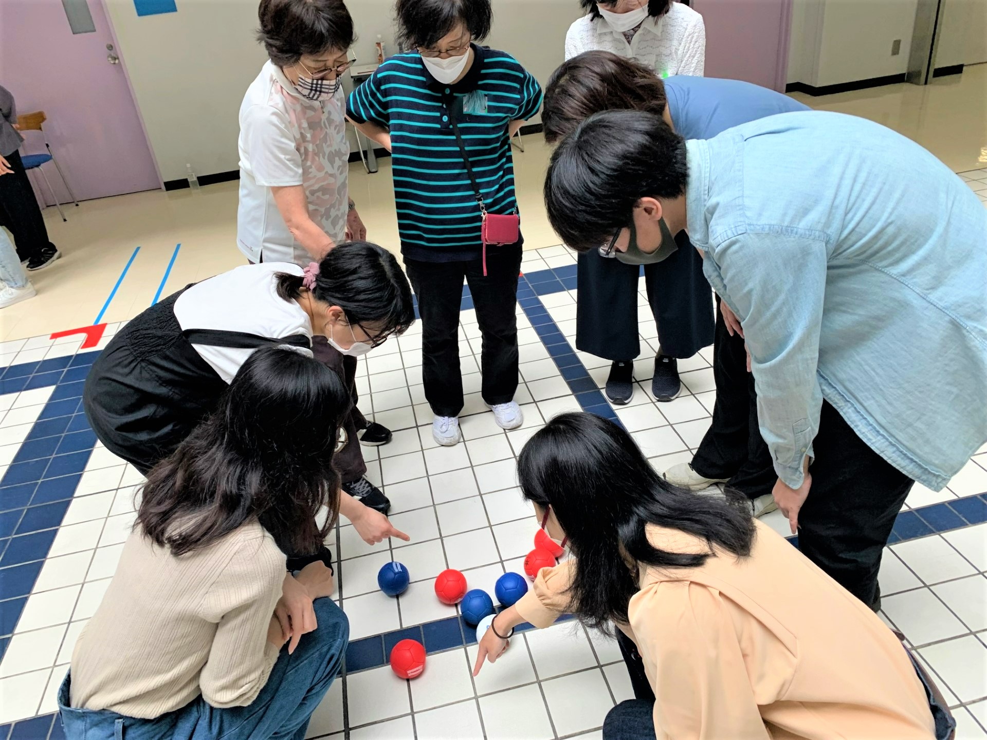 今回は2部構成で開催しました。1部は年齢、性別、障がいのあるなしにかかわらず、すべての人が一緒に競い合うことができ、パラリンピックの正式種目でもある「ボッチャ」をチーム対抗で行いました。「ボッチャ」未経験の学生がほとんどだったため、まずはボッチャコーチの資格をお持ちの和泉ボランティアセンター副センター長の後藤光将教授(政治経済学部)に、ボッチャのコーチングをしてもらい、さらに参加されるケア24永福のスタッフの方々をお招きして高齢者の方々がけがのないように楽しめるようアドバイスをいただきながら、十分に準備を行いました。迎えた本番は、チーム対抗で優勝チームを決めることで白熱したゲームになりました。優勝チームには手作りのメダルの授与もあり、大盛り上がりでした。高齢者の方々からは、『勝って「うれしい!」負けて「悔しい!」という感情を普段の生活の中では感じることがあまりないので感情を表に出すことはよい刺激になります』とお話頂きました。