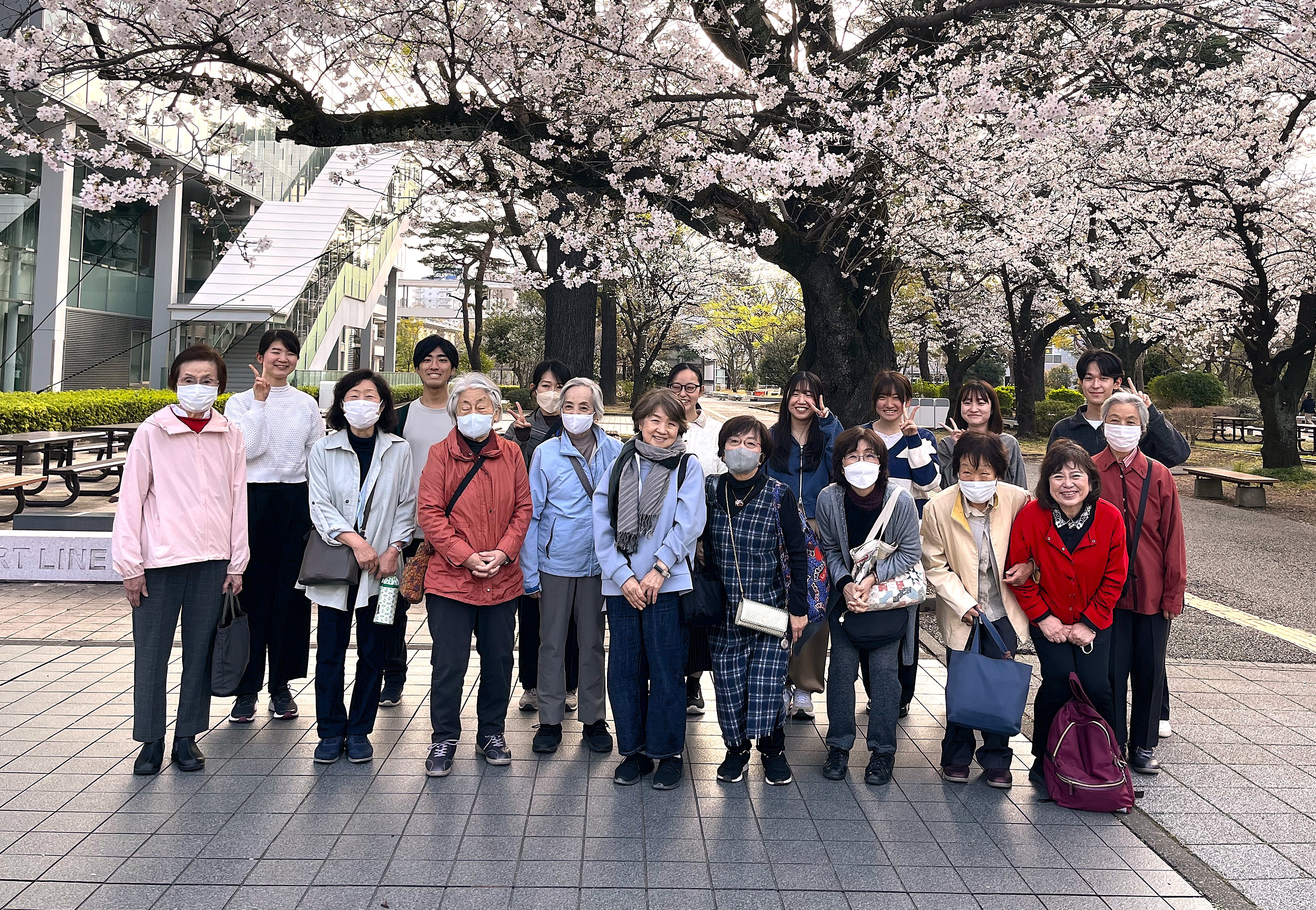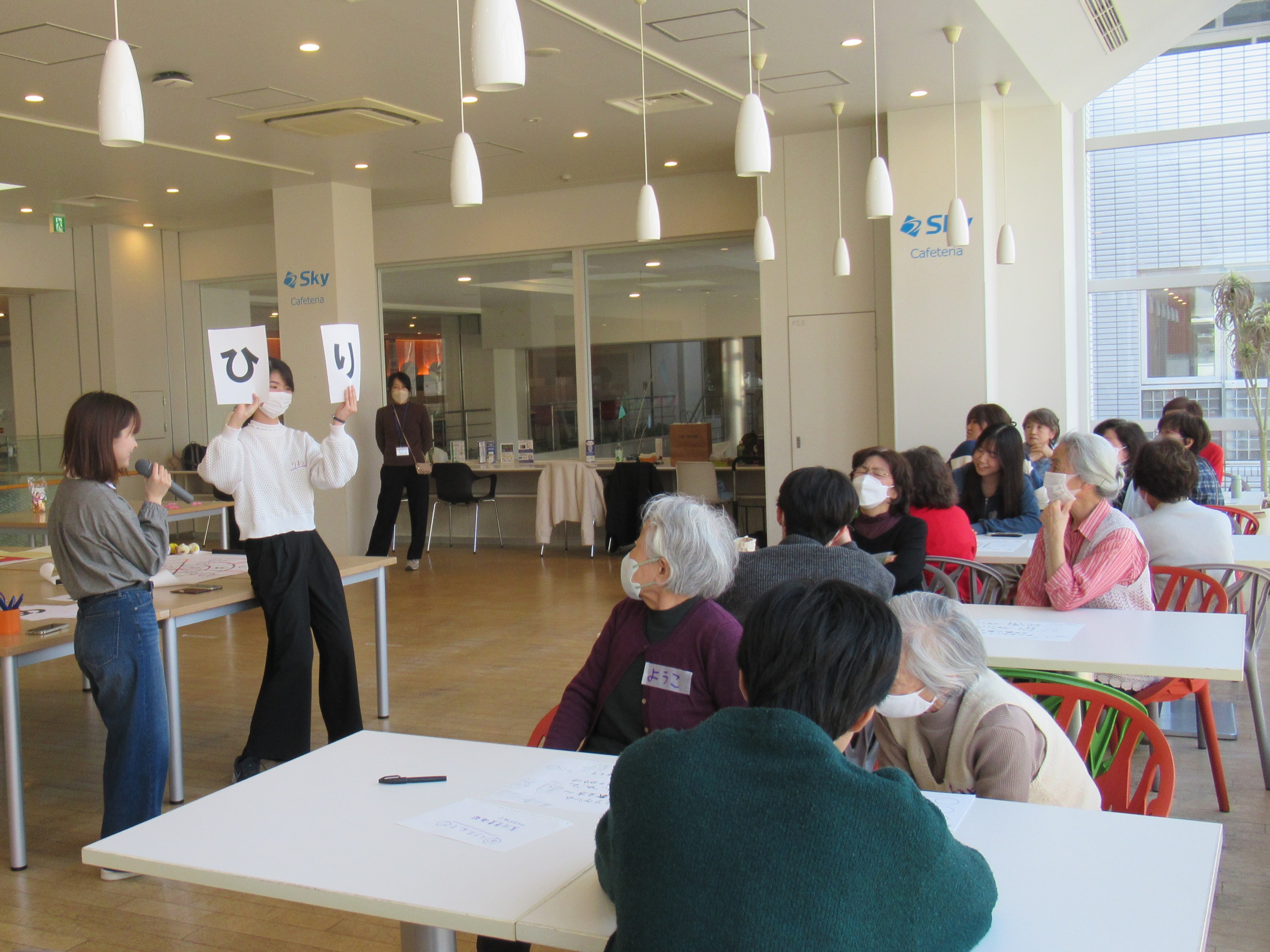参加者と学生が一緒になって、楽しみ、歓声が上がり、笑顔と笑い声で満たされた会になりました。また会場となった明治大学・和泉の杜(食堂)からは満開の桜が望め、華やかな景色が会に彩りを添えていました。