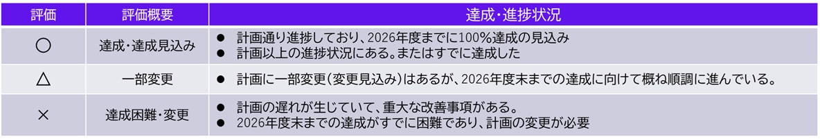 このたび、5年計画におけるこれまでの3カ年(2022年度~2024年度)の計画の実施状況をまとめ、目標に対する達成度および進捗についての中間総括を実施しました。各施策の評価を行うことで、今後の2カ年(2025年度~2026年度)に向けた課題の整理や取組の有効性の検証を行うとともに、重点的に強化すべき施策を検討し、最終目標の達成に向けて着実に前進してまいります。