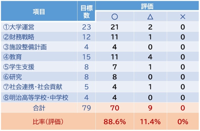 第3期中期計画の計8項目(「大学経営・運営」、「財務戦略」、「施設整備計画」、「教育」、「学生支援」、「研究」、「社会連携・社会貢献」、「明治高等学校・中学校」)における79の目標に対する達成及び進捗状況を評価しました。