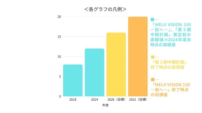 長期ビジョン「MEIJI VISION 150-前へ—」で掲げる14の数値目標に対する達成度及び進捗について示しています。