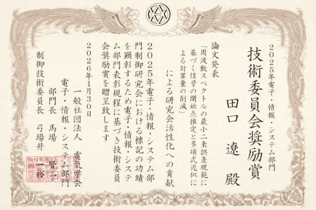 [Graduate School of Science and Technology] TAGUCHI Ryo receives IEEJ EIS Research Group Encouragement Award