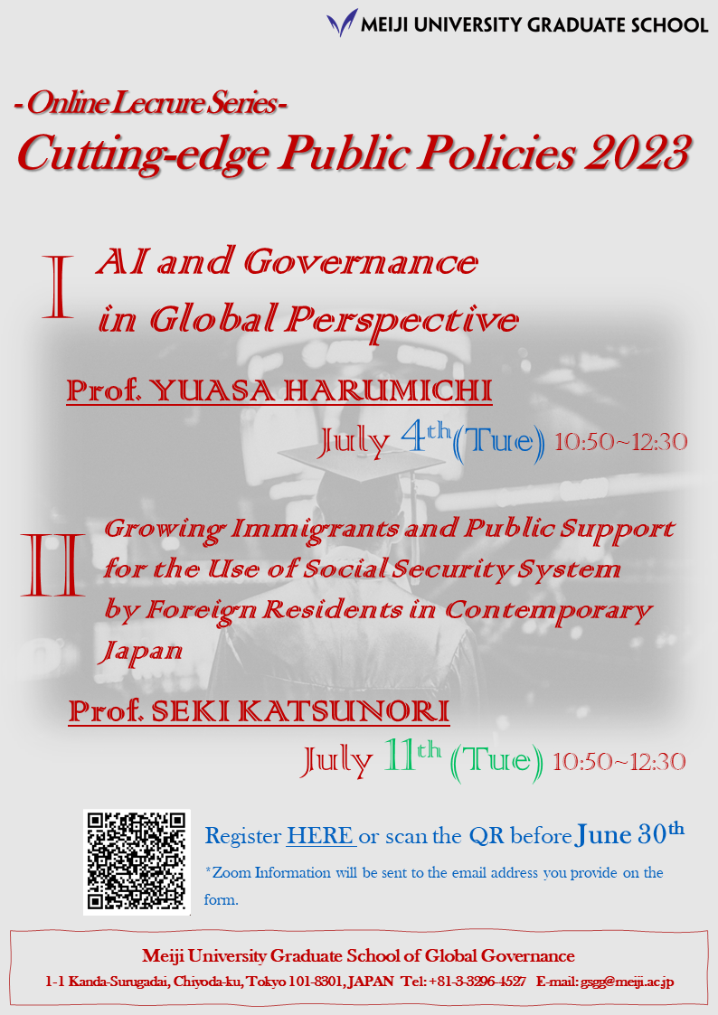 | Theme | 1 July 4th (Tue), 2023 AI and Governance in Global Perspective Prof. YUASA HARUMICHI 2 July 11th (Tue), 2023 Growing Immigrants and Public Support for the Use of Social Security System by Foreign Residents in Contemporary Japan Prof. SEKI KATSUNORI |