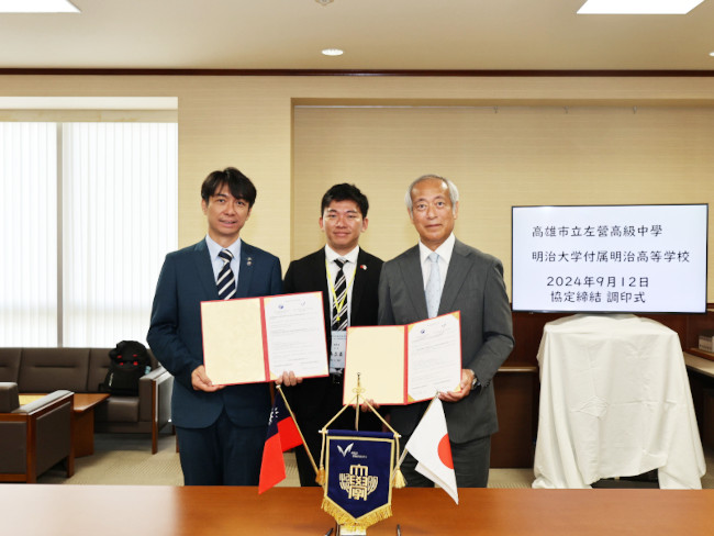 On September 12, 2024, a delegation including Mr. Pai-Hung Lin, Principal of Kaohsiung Municipal Zuoying Senior High School, and Mr. Li-Sen Wu, Director of the Kaohsiung Municipal Education Bureau, visited Meiji University High School to sign an academic exchange agreement, which was concluded between the two schools.