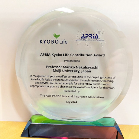 Professor NAKABAYASHI Mariko received the 2024 APRIA Kyobo Life Contribution Award in recognition of her contribution to the development of the Asia-Pacific Risk and Insurance Association (APRIA) through research, education, and management of the association.