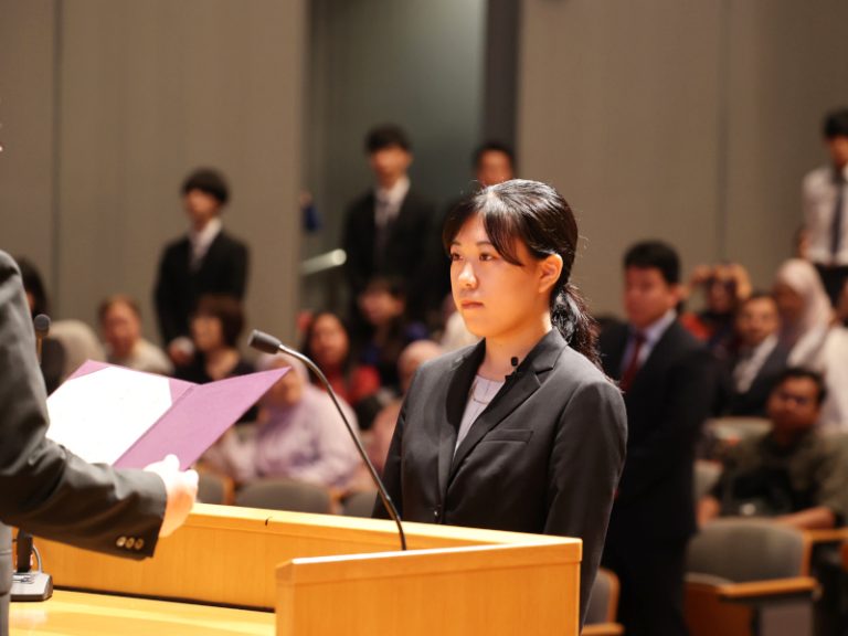 TAKAMI Chihiro (School of Agriculture) receiving graduation certificate on behalf of the undergraduate students