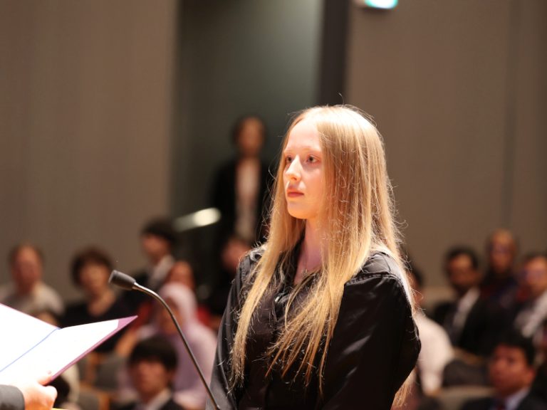 Tetiana VOZNIAK (School of Global Japanese Studies) receiving degree certificate on behalf of the undergraduate Ukrainian students