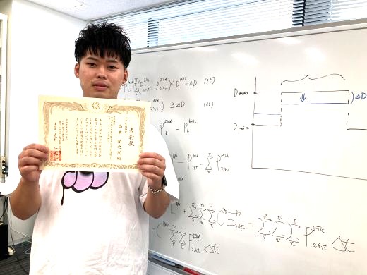 TAKAGI Shinnosuke, a first-year Master's student in the Network Design Program, Graduate School of Advanced Mathematical Sciences (TAMURA Shigeru Laboratory), received the YPC Encouragement Award at the 2025 IEEJ Power and Energy Society Conference, held at the University of the Ryukyus on September 17, 2025.