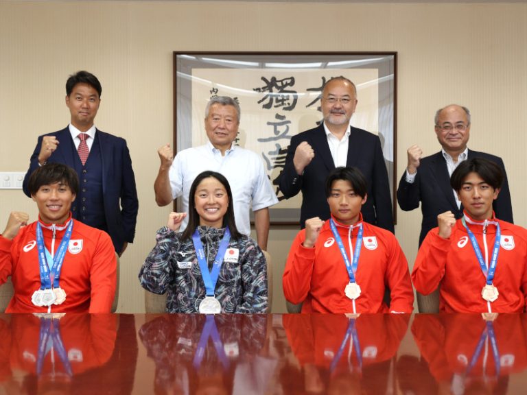 On August 26, club coach SANO Hidemasa and players paid a courtesy call to President UENO Masao and Executive Trustee (Student Affairs) KONISHI Tokuou. They reported on their achievements on the international stage, including NARITA Mio’s silver medal at the World Aquatics Championships in the 400-Meter Individual Medley and many players, including WATANABE Yuta, a third-year student at the School of Business Administration, won prizes at the FISU Summer World University Games.