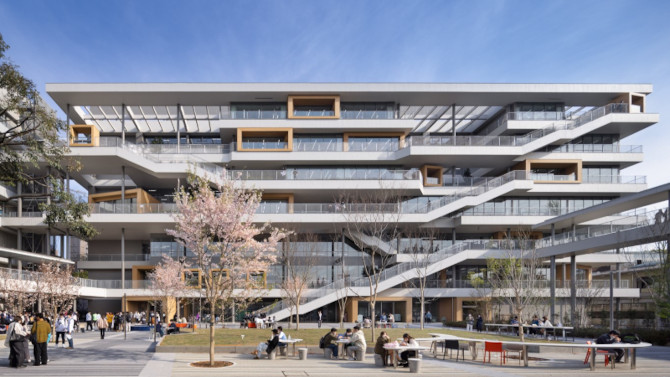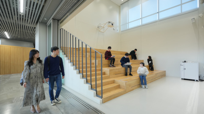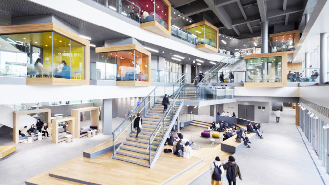 "The atrium, where the learning commons unfolds across multiple levels, is outstanding. While each student has their own learning environment, the spatial design fosters a relationship where they can catch glimpses of one another's learning scenes. The design follows the architectural philosophy of Sutemi Horiguchi, and successfully creates an integrated environment—from the landscape to the façade—where students can learn actively."