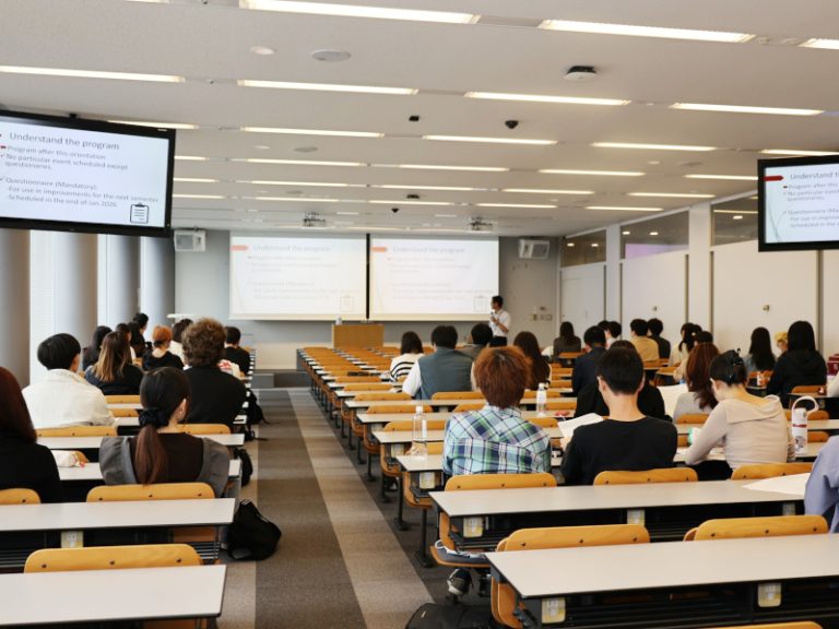 The orientation at Surugadai Campus served as the first meeting for students with their pre-matched partners, with approximately 60 students participating. At the beginning, an icebreaker session was held that also served as an opportunity for students to introduce themselves, and smiles gradually appeared on the faces of the students who had been nervous. After that, the administrative office explained the program and introduced tips for language exchange, which the participating students listened to with keen interest.