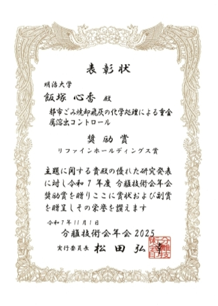 The research presentation by IIZUKA Koko (4th-year undergraduate student, Koike Laboratory) of the Department of Applied Chemistry, Faculty of Science and Technology, has received the Corporate Encouragement Award at the Society of Separation Process Engineering, Japan (SSPEJ) Annual Meeting 2025 .