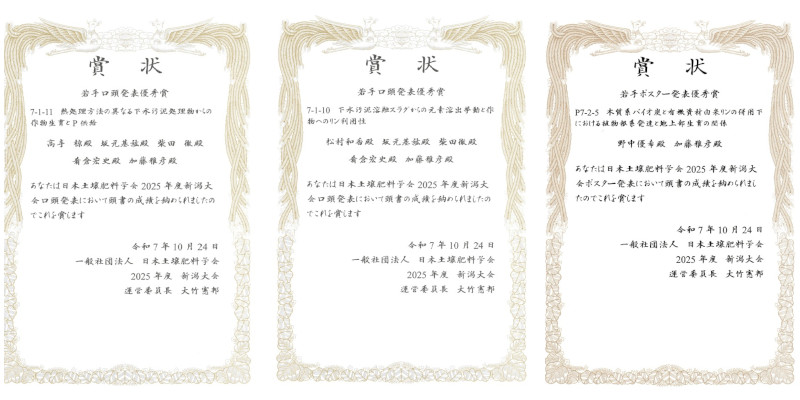 At the 2025 Niigata Conference of the Japanese Society of Soil Science and Plant Nutrition, held in September 2025, MATSUMURA Nodoka (1st year doctoral student at the Agricultural Chemistry Program, Graduate School of Agriculture), and TAKATERA Muku (4th-year student at the Department of Agricultural Chemistry, School of Agriculture), both from the Laboratory of Soil Science, received the Best Oral Presentation Award for Young Scientists, and NONAKA Yuki (2nd-year doctoral student at the Agricultural Chemistry Program, Graduate School of Agriculture) from the same laboratory received the Best Poster Presentation Award for Young Scientists.