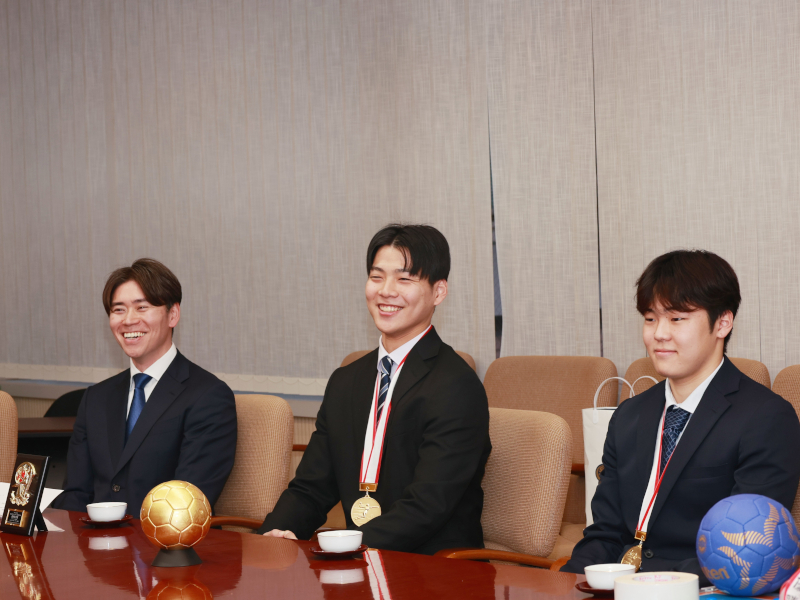 On November 26 at the Surugadai Campus, the Handball Club paid a courtesy visit to President UENO Masao and Chairman YANAGIYA Takashi.