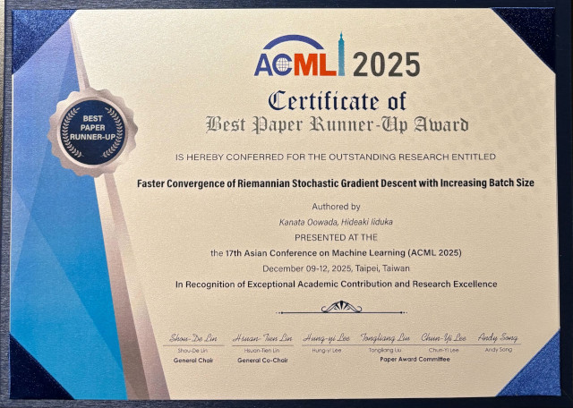 The Mathematical Optimization Laboratory, led by Professor IIDUKA Hideaki, received the Best Paper Runner-Up Award at the prestigious international conference The 17th Asian Conference on Machine Learning (ACML2025), held in Taipei, Taiwan, from December 9 -12, 2025.