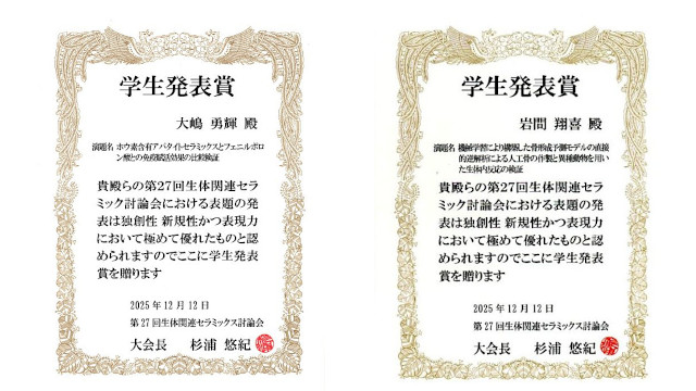 OSHIMA Yuki (2nd-year master’s student, Laboratory of Biomaterials) and IWAMA Shoki (1st-year master’s student, Laboratory of Biomaterials) received the Student Presentation Award at the 27th Symposium on Ceramics in Medicine, Biology and Biomimetics.