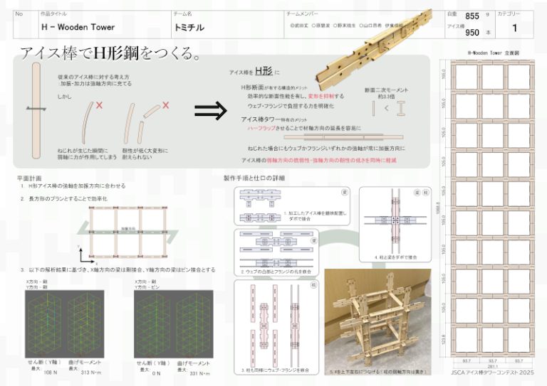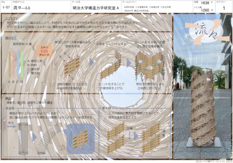 Student groups from the Structural Mechanics, Kobayashi Laboratory (Professor KOBAYASHI Masahito) and the Architecture & Structural Engineering Laboratory (Associate Professor TOMIZAWA Tetsuya) in the Department of Architecture, School of Science and Technology, participated in the JSCA Popsicle Tower Contest 2025 held by the Japan Structural Engineers Association (JSCA) on November 29 at Nihon University Faculty of Science and Engineering Surugadai Campus, winning the Most Popular Award and the Elegant Award.