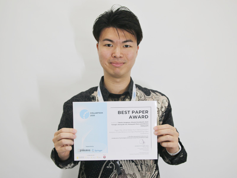A paper authored by IMAGAWA Taketo (2nd-year Master’s student), KUROKOCHI Atsuto (1st-year Master’s student), YANAGII Koki (1st-year Master’s student), and Professor KOBAYASHII Minoru from Frontier Media Science Program, Graduate School of Advanced Mathematical Sciences, together with Professor ISO Kazuyuki from Tokyo Information Design Professional University, IHARA MASAYUKI from RIKEN, received the Best Paper Award at The 31st International Conference on Collaboration Technologies and Social Computing (CollabTech 2025), held from November 4 to 7, 2025, in Indonesia.