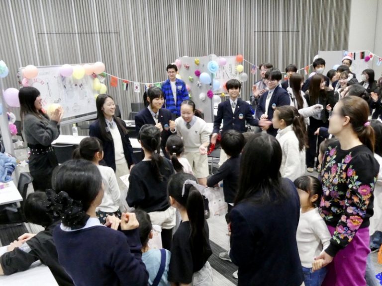 In a multipurpose room, the children’s workshop titled To New Worlds with Latin Rhythms! drew about 30 children, who experienced Latin culture through a quiz session and games. The workshop was jointly run by approximately 30 students from Tsuchiura Nihon University Secondary School and Meiji University students, creating a vibrant, inclusive space where university, high‑school, and junior‑high students mingled with children from the local community across generations.