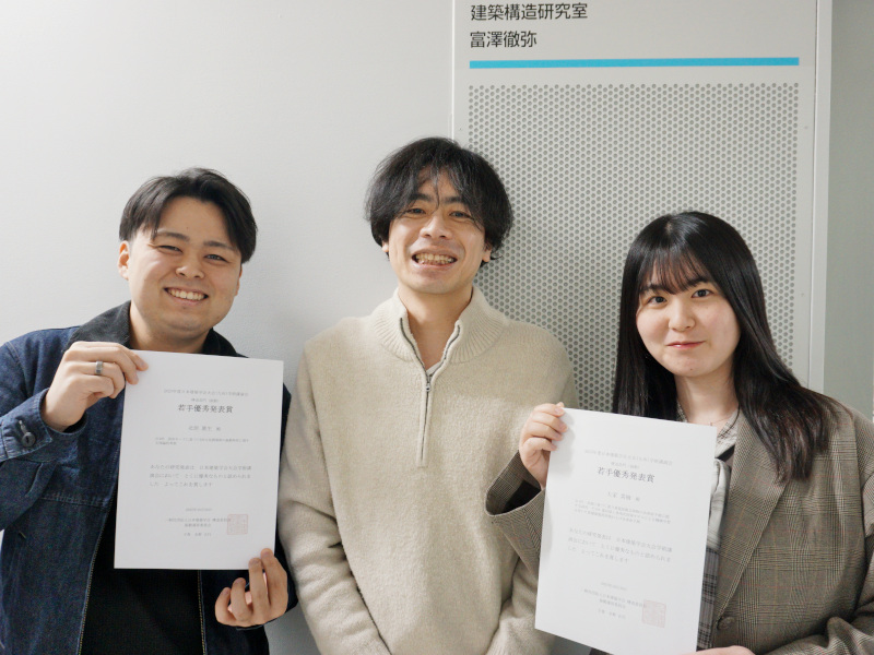 KITAHARA Mao, a second-year master’s student, and TAIKE Natsumi, a first-year master’s student, in the Architecture and Urbanism Program, Graduate School of Science and Technology (both members of the Architectural Engineering Laboratory (Associate Professor TOMIZAWA Tetsuya), received the Young Researcher Award for Outstanding Presentation in the Structural Engineering Division (Vibration Field) at the 2025 Architectural Institute of Japan Annual Convention (AIJ 2025 Kyushu), held from September 9 to 12, 2025, at Kyushu University’s Ito Campus.