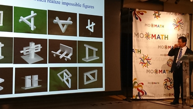 I then went to New York to give a lecture at the National Museum of Mathematics (MoMath) in Madison Square as part of the monthly series of lectures called Math Encounters. The 170-seat venue for the lecture, advertised as The Amazing Work of Kokichi Sugihara, was full and I introduced impossible three-dimensional objects and explained the background mathematical structure. I also exhibited five ambiguous objects at the venue before and after the lecture. Even though there was a Q&A session at the end of the 90-minute lecture, people were still asking many questions even after the lecture finished.