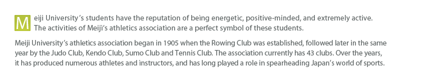 Meiji University's students have the reputation of being energetic, positive-minded, and extremely active. The activities of Meiji's athletics association are a perfect symbol of these students. more