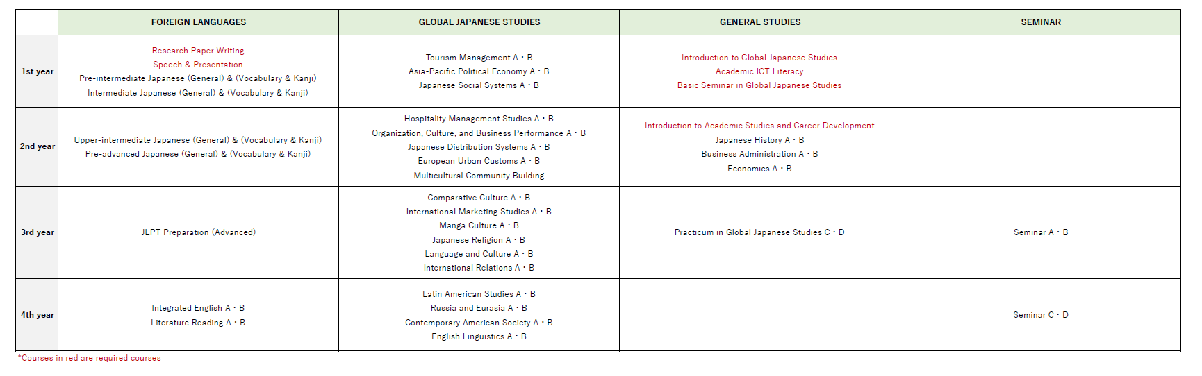 This is an example of a course selection designed to deepen students' flexible understanding of both Japanese and other countries' cultures, including subjects related to tourism and distribution system, and to enable them to play an active role at the forefront of rapidly expanding international business.