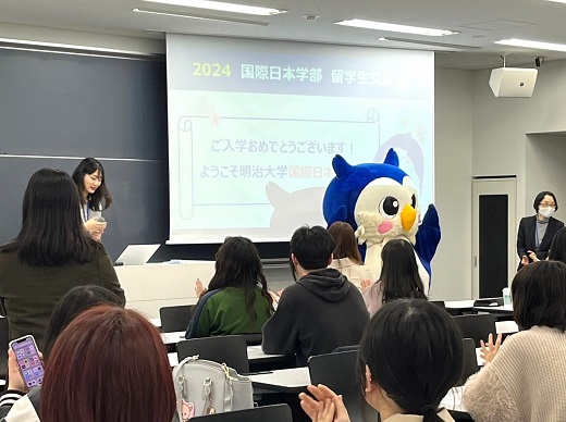 A total of 56 people attended the event, including 39 new students, 12 senior international students, and faculty members (Professor KOMORI Kazuko, Associate Professor YANAGISAWA Emi, Assistant Professor HUANG CongCong, etc.). Meijiro, the official character of Meiji University, appeared as a secret guest.