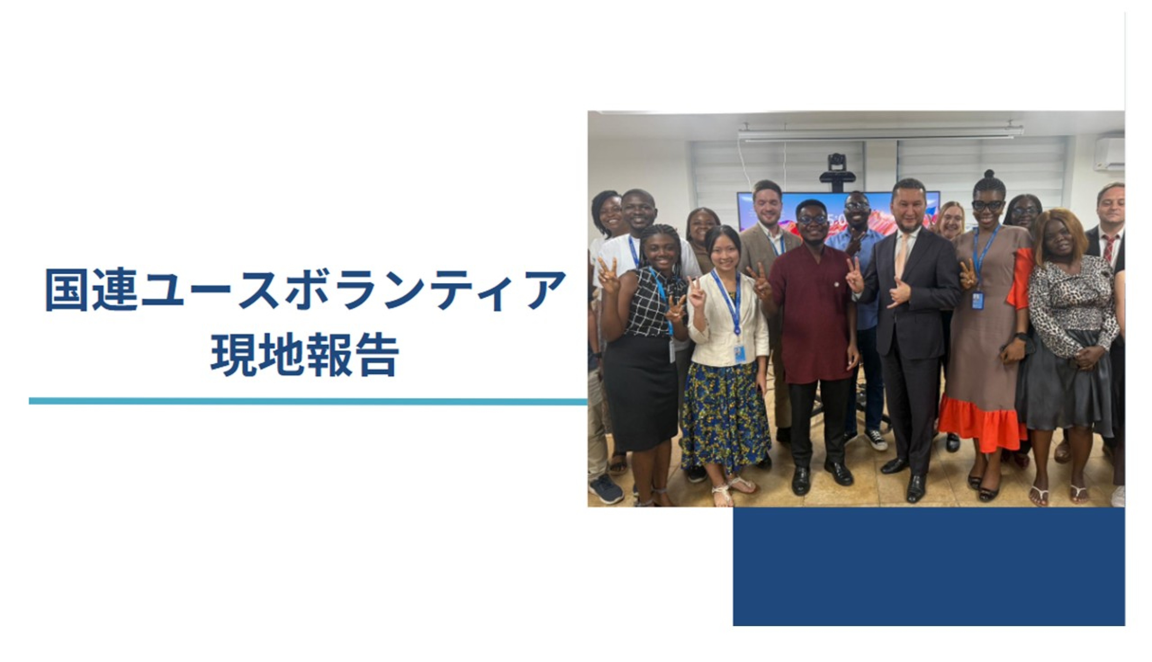 続いて、現在2025年度国連ユースボランティアとしてアフリカ・ガーナのUNCDF(国連資本開発基金)で活動中の結城美桜さん(国日3年)が現地報告を実施。冒頭に、結城さんが執務環境をカメラで見せてくださり、参加者は普段の活動の様子をイメージしながらお聴きすることができました。