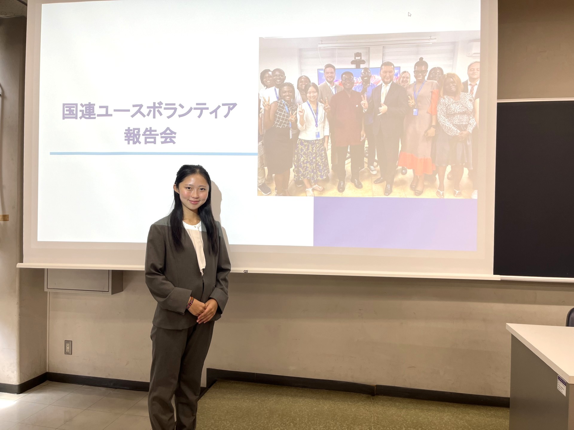 4月20日のランチタイムに和泉キャンパスにおいて、2025年度国連ユースボランティア派遣者である結城美桜さん(国際日本学部4年)による帰国報告会が開催されました。当日は多くの学生が来場し、本プログラムへの関心の高さがうかがえました。