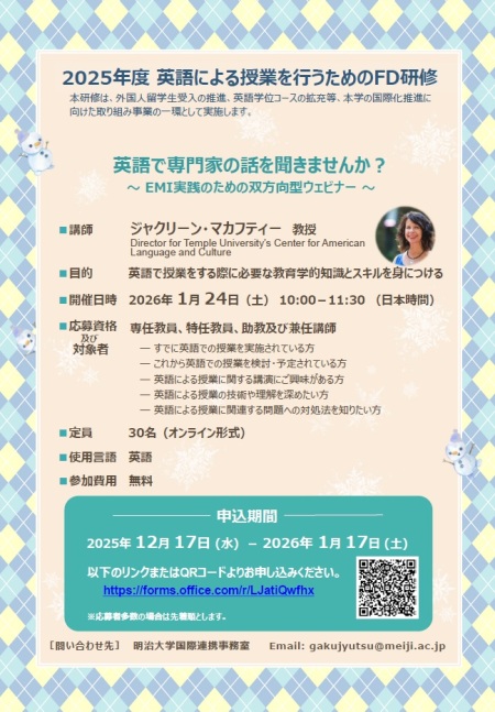 - 2025年1月11日 英語による授業を行うためのFD研修 ウェビナー「英語で授業をするための教授法ー教育学的知識と実践」を開催