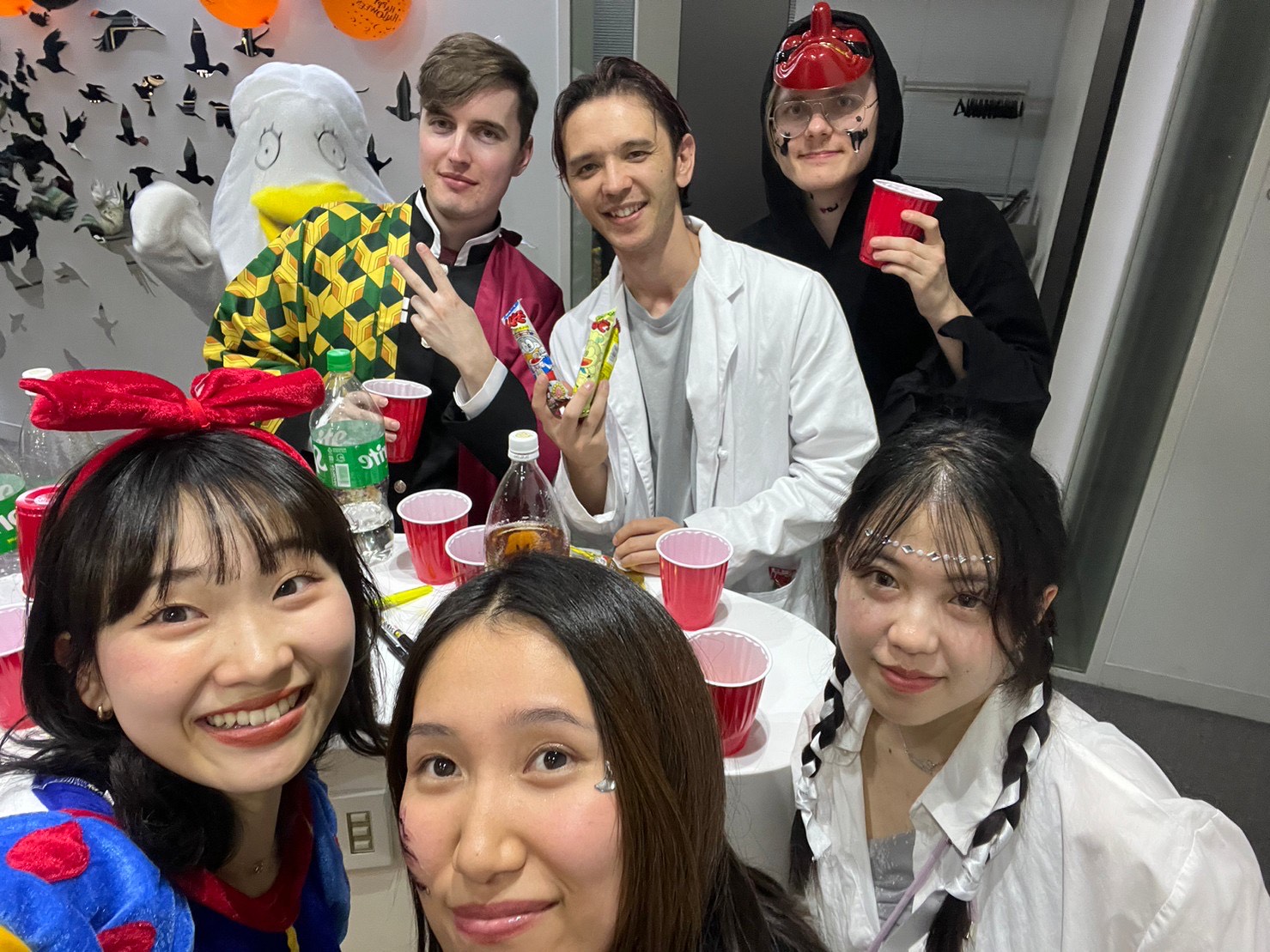 当日は約60人の学生が参加し、多くの学生が仮装のコスチュームでパーティーに参加しました。日本人の学生だけでなく、様々な国からの留学生が参加しました。