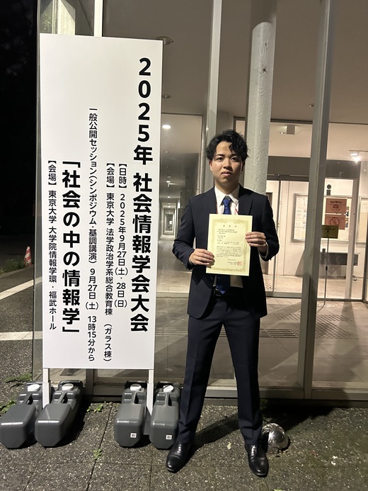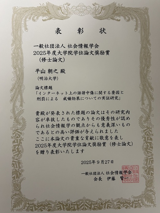平山さんが受賞した論文テーマは以下のとおりです。 「インターネット上の誹謗中傷に関する要因と刑罰による威嚇効果についての実証研究」