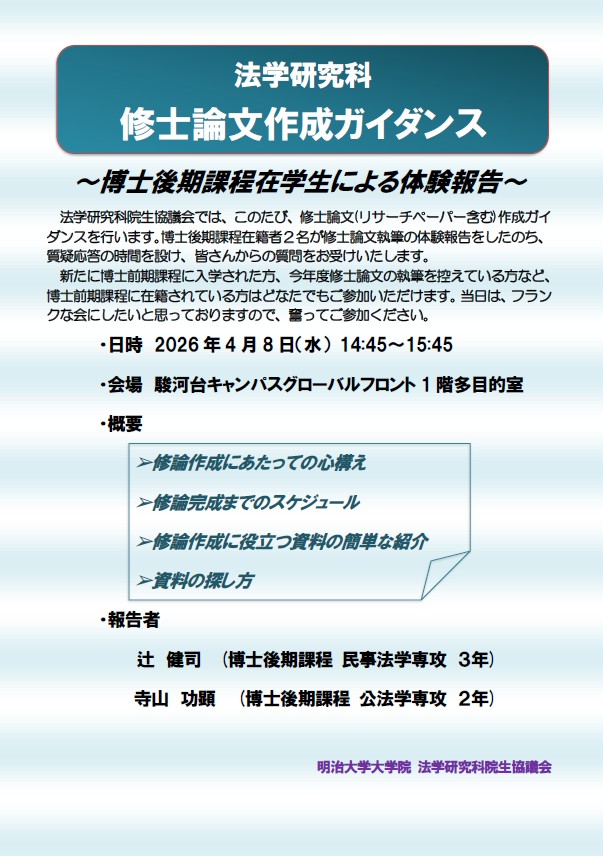 法学研究科・院生協議会では、このたび、修士論文(リサーチ・ペーパー含む)作成ガイダンスを行います。博士後期課程在籍者2名が修士論文執筆の体験報告をしたのち、質疑応答の時間を設け、皆さんからの質問をお受けいたします。